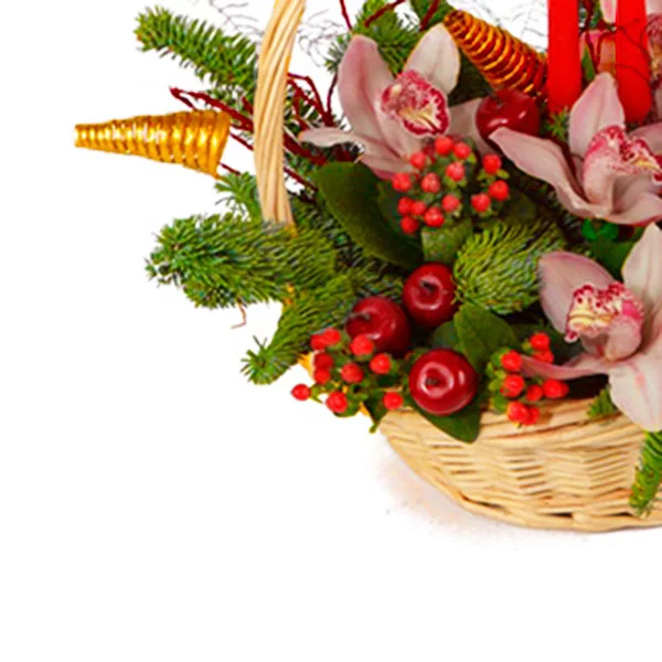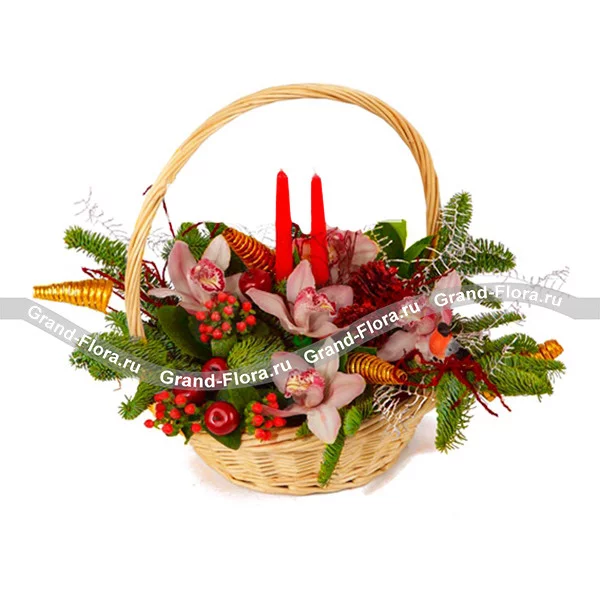 Эффектная новогодняя корзина в ярких красках, очаровательные цветы орхидеи поразят Вас своим изяществом.