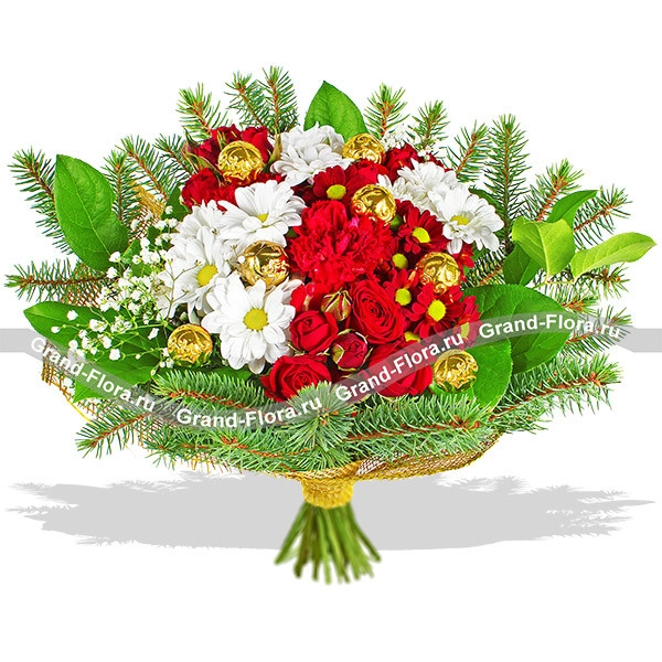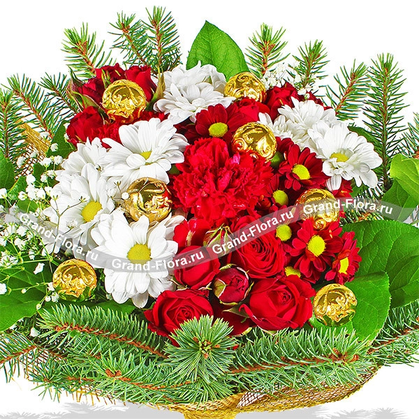 Стандартный (на фото): хризантема белая кустовая - 2 шт., хризантема красная кустовая - 2 шт., гвоздика красная - 3 шт., роза красная кустовая - 3 шт., гипсофила - 2 шт., еловая ветвь, новогодний декор и зелень, сетка.