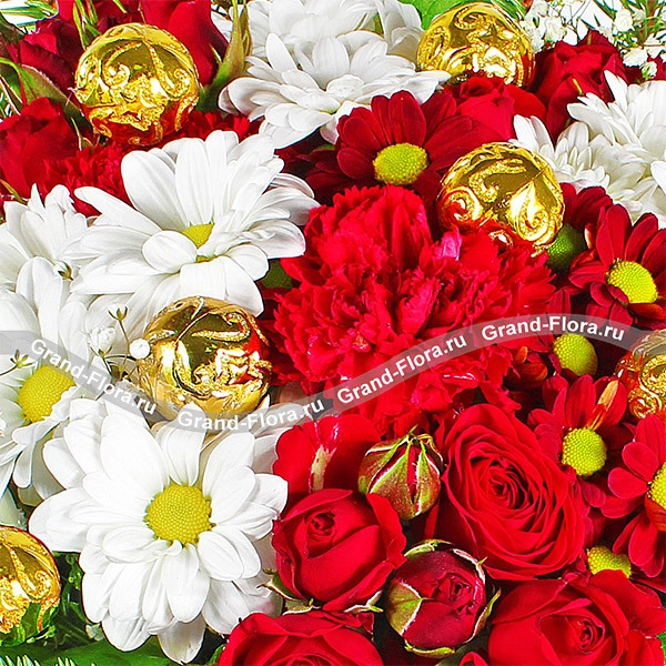 ЛЮКС: хризантема белая кустовая - 5 шт., хризантема красная кустовая - 4 шт., гвоздика красная - 5 шт., роза красная кустовая - 4 шт., гипсофила - 3 шт., еловая ветвь, новогодний декор и зелень, сетка.