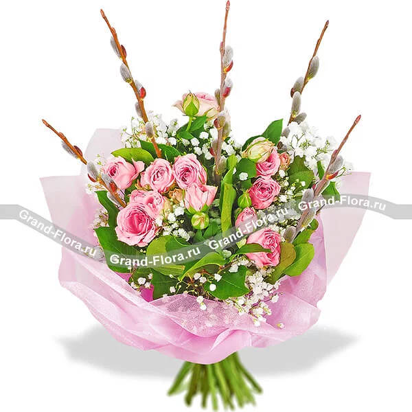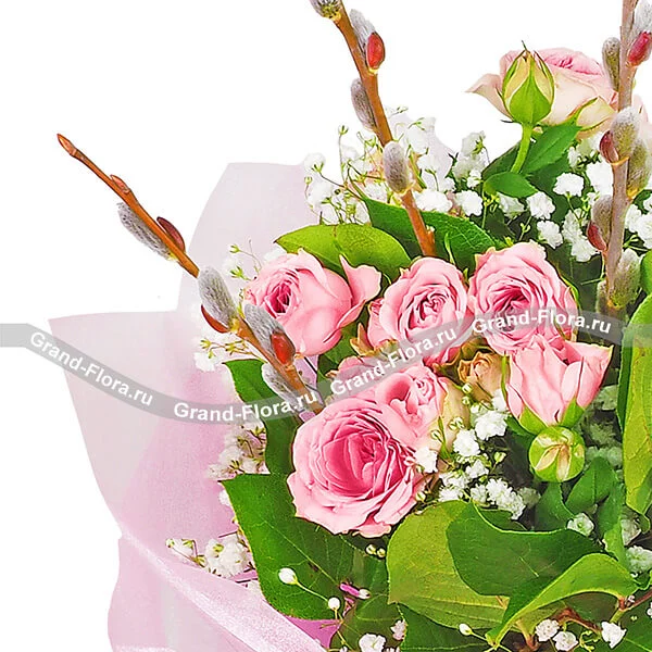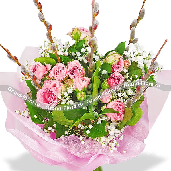 Уменьшенный: роза розовая кустовая - 3 шт., гипсофила - 2 шт., верба - 3 шт., декоративная зелень, фетр розовый, белый бант.