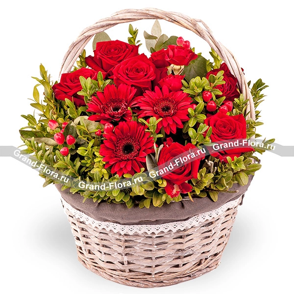 Стандартный: роза красная - 4 шт., гербера красная - 4 шт., роза кустовая красная - 3 шт., декоративная зелень., гиперикум красный - 2 шт., оазис, корзина средняя.