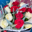 25 роз: роза красная, белая - 25 шт., эвкалипт - 7 шт., упаковка, бант